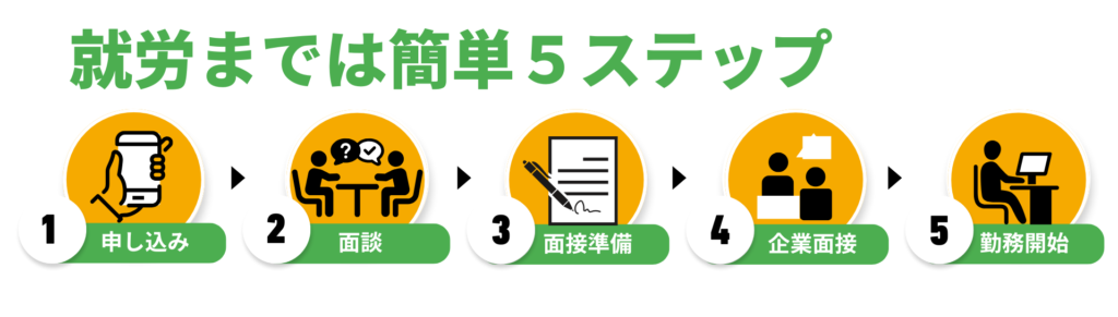 - ⑤ 勤務開始:支援員が伴走し、定着まで一緒にサポート